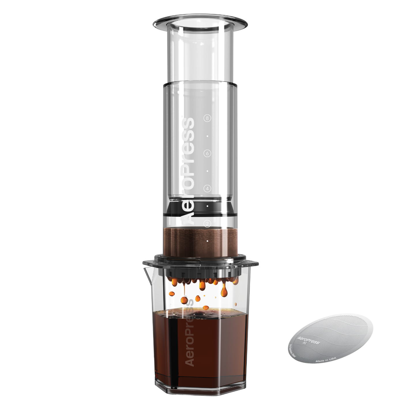 Brew bigger with the AeroPress Clear XL + Stainless Steel Filter XL bundle—designed for serious coffee lovers who want even more delicious coffee anywhere life takes them. The crystal-clear. shatterproof Tritan™ AeroPress Clear XL delivers the same smooth. rich coffee you know and love from the AeroPress Clear—now in a larger size. Paired with our reusable stainless steel filter. this bundle lets flavorful oils through while keeping out grit. so you get a clean. full-bodied cup with zero waste. Just brew. rinse. pack up and go! Whether you’re at home. in a camper. or on the road. this setup delivers consistently great coffee—fast.